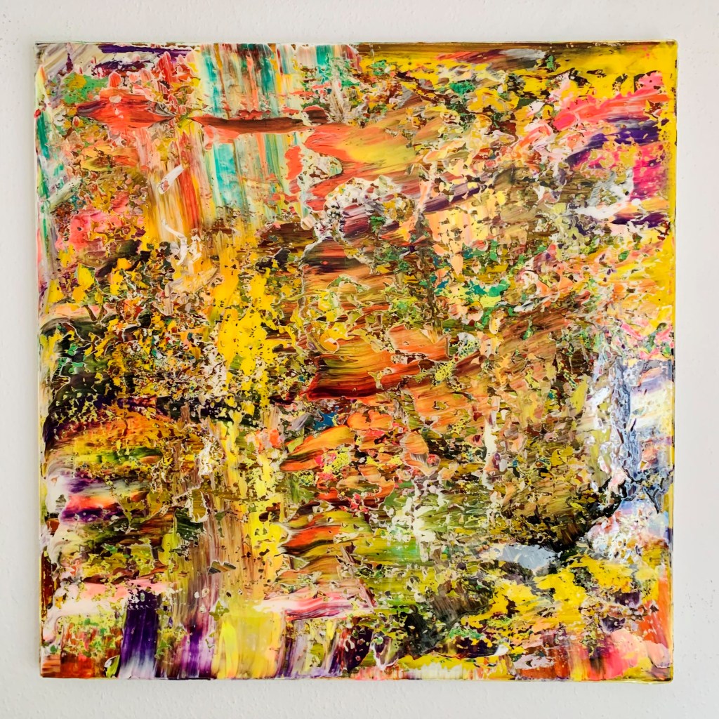 Three paintings of my current project HA³ – Holographic-Abstract-Art. I use many layers of acrylic and oil which I shape, separate and scrape to get destinct deep structures. The final painting is sealed with resin which creates several focal layers and a 3-dimensional presentation.
